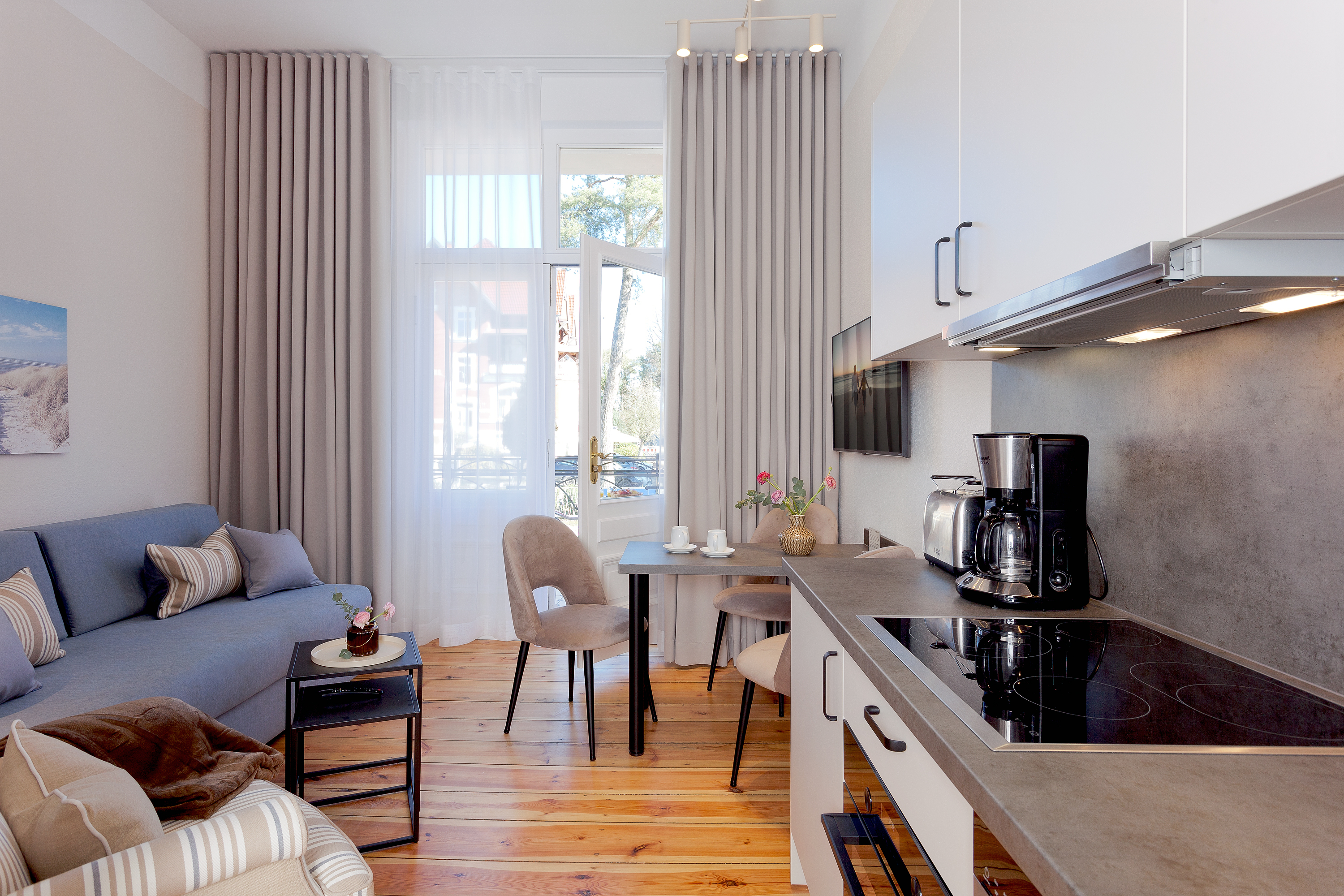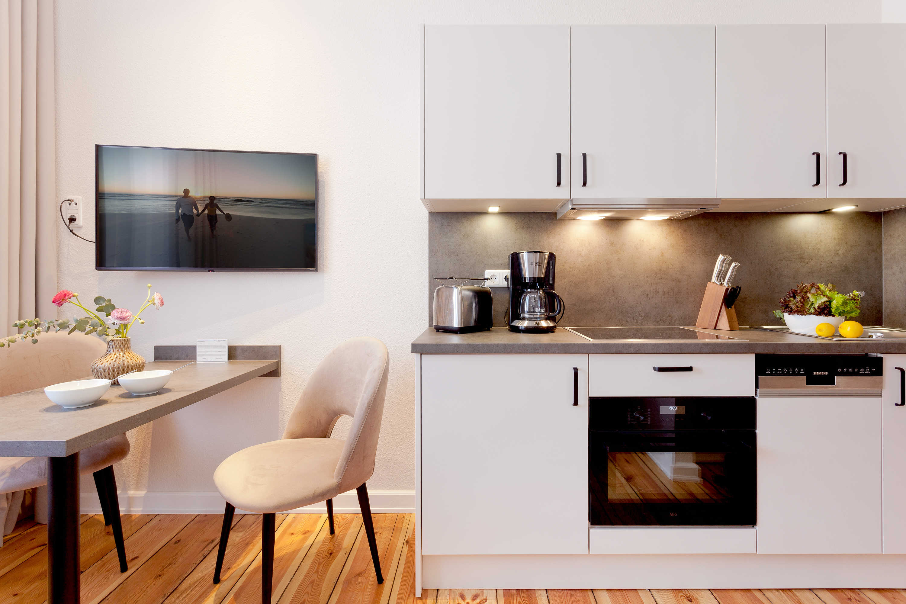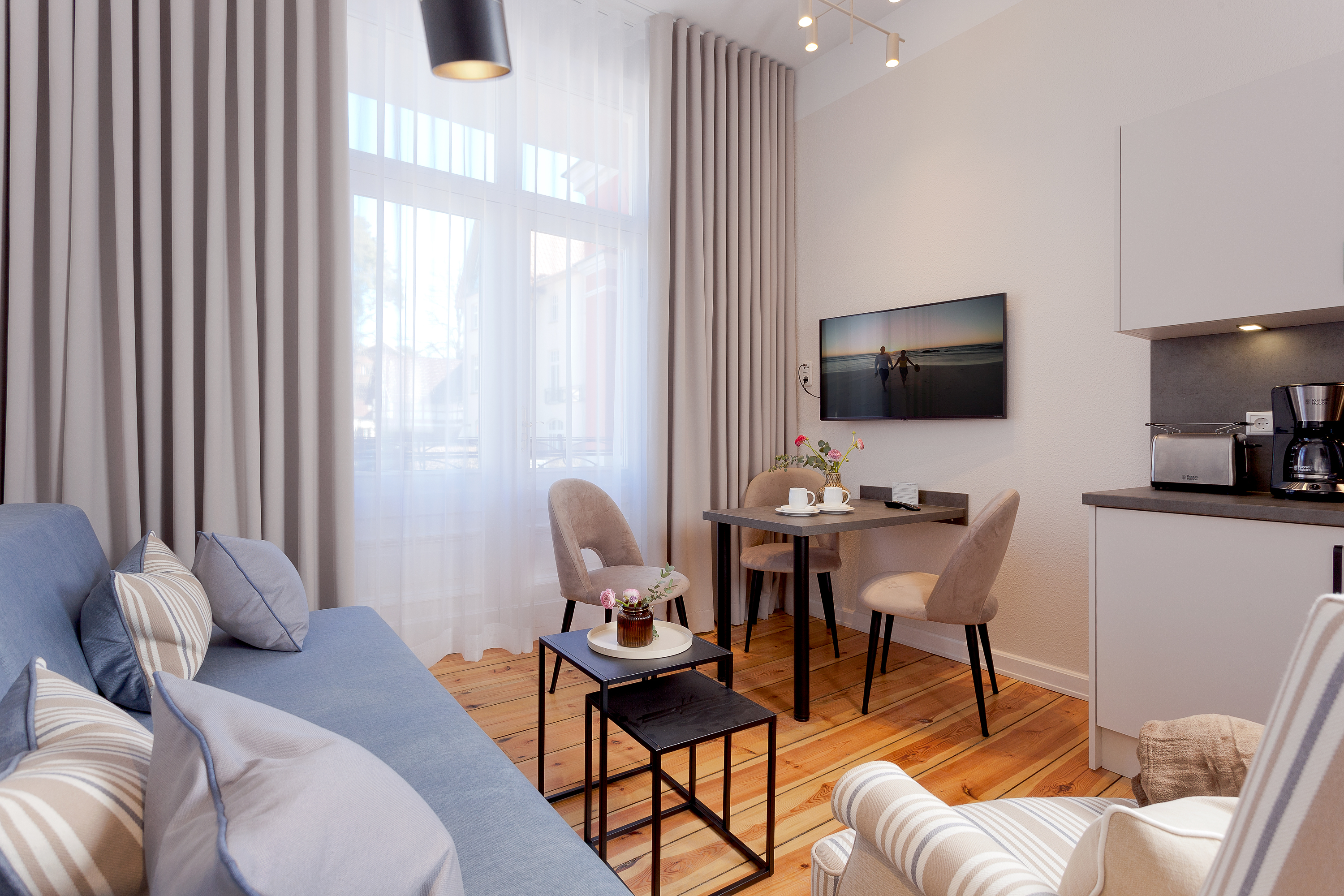 Unser Appartement 6 ist mit ca. 34 qm, einer integrierten Single-Küchenzeile und einem separaten Schlafzimmer und Bad ideal für bis zu 3 Personen. Lassen Sie Ihren erlebnisreichen Tag entspannt auf dem gemütlichen Sofa Revue passieren, welches für die Nacht im Nu zu einem Schlafplatz für einen dritten Gast umfunktioniert werden kann. Oder genießen Sie Ihr Dinner am Esstisch für drei. Vom Wohnzimmer aus gelangen Sie auf Ihren möblierten Balkon für noch mehr Freiraum. WiFi und Parkplatz sind inklusive.