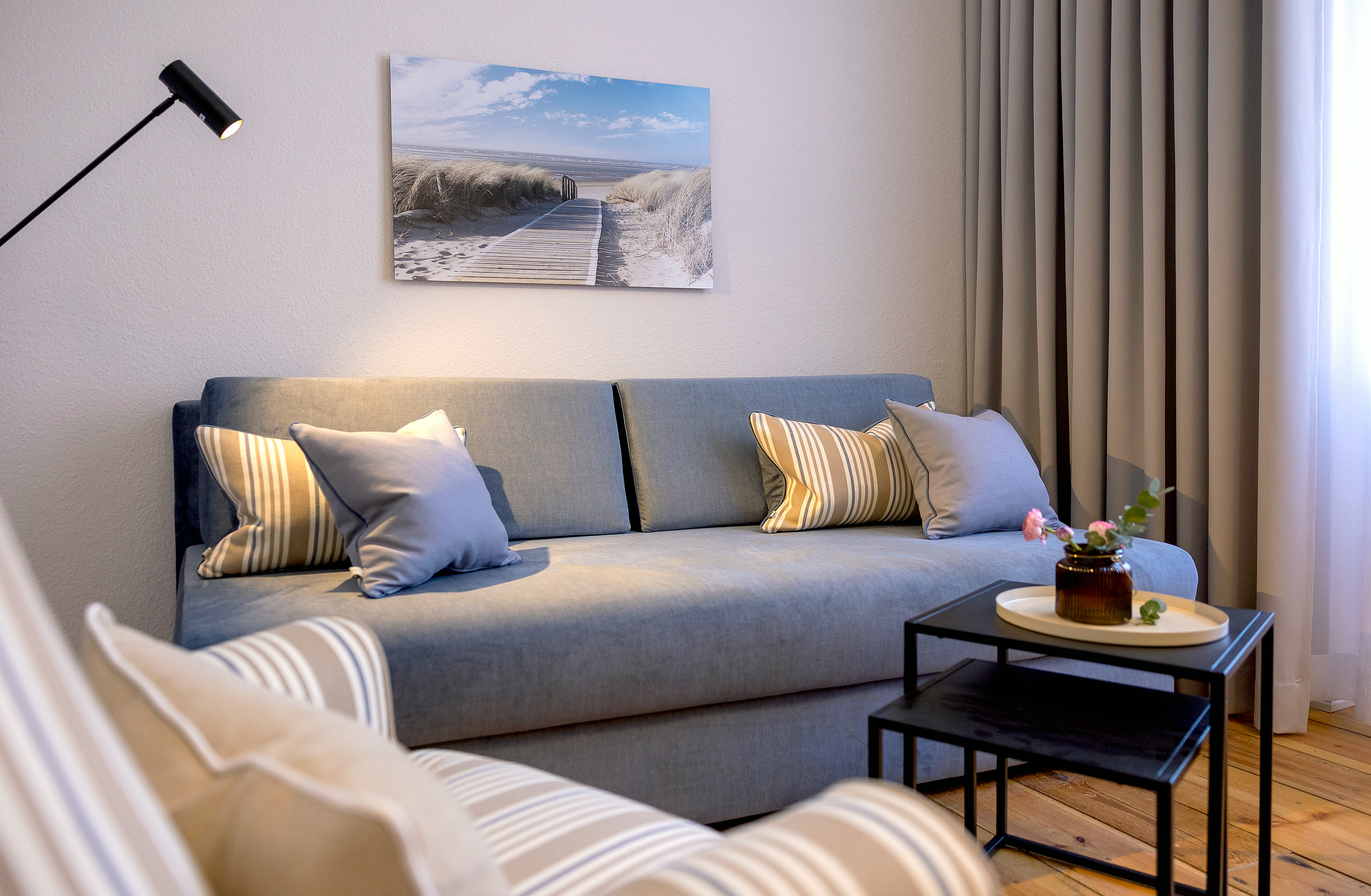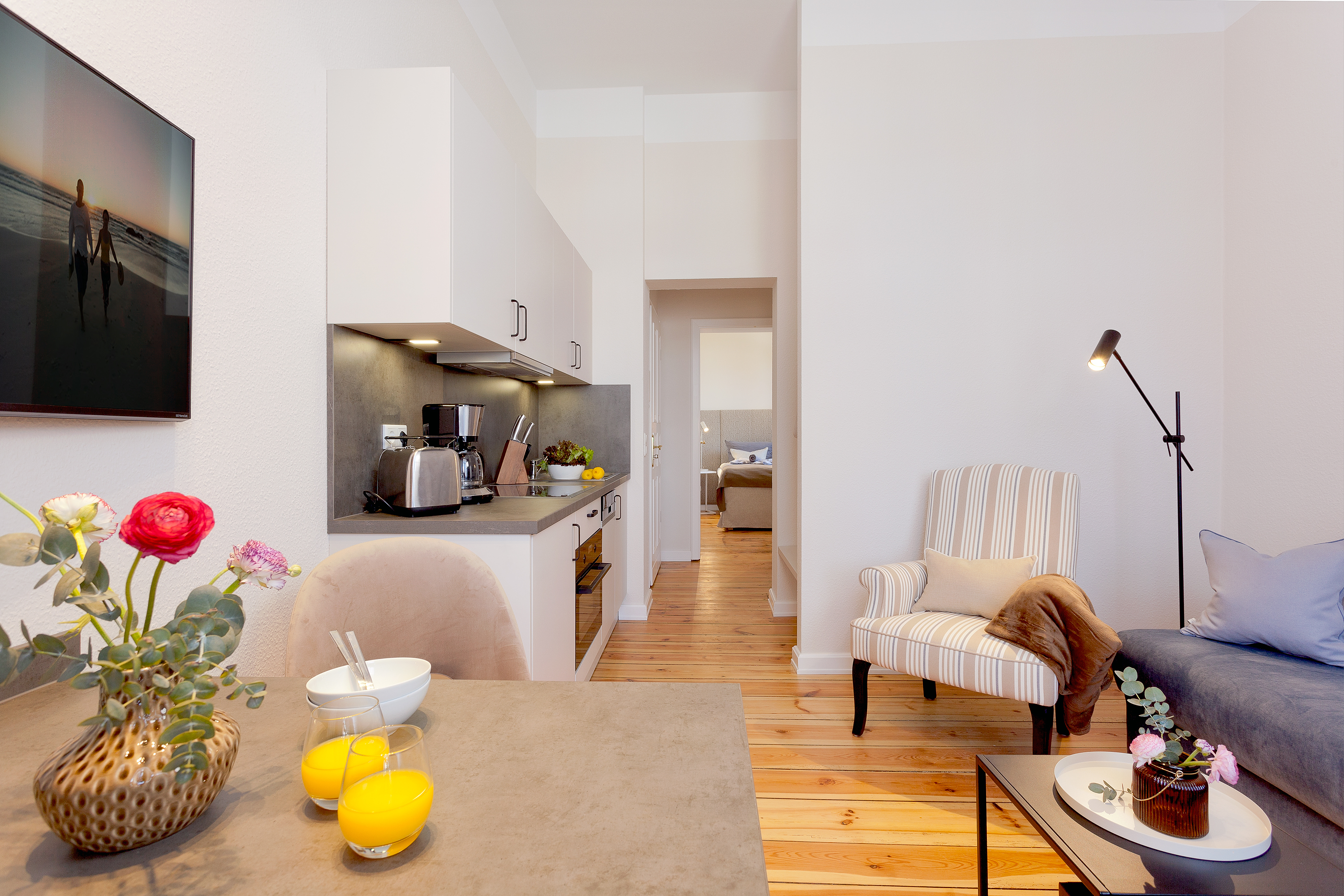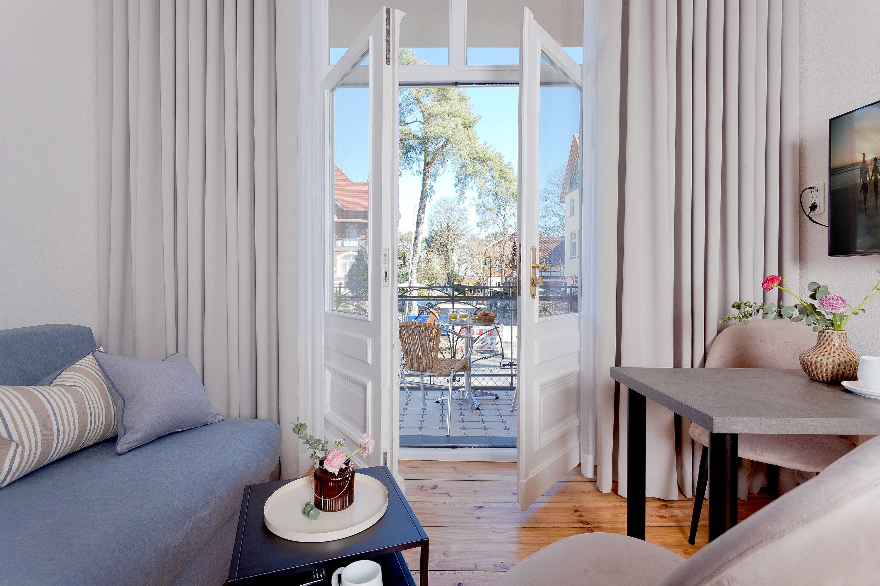 Unser Appartement 6 ist mit ca. 34 qm, einer integrierten Single-Küchenzeile und einem separaten Schlafzimmer und Bad ideal für bis zu 3 Personen. Lassen Sie Ihren erlebnisreichen Tag entspannt auf dem gemütlichen Sofa Revue passieren, welches für die Nacht im Nu zu einem Schlafplatz für einen dritten Gast umfunktioniert werden kann. Oder genießen Sie Ihr Dinner am Esstisch für drei. Vom Wohnzimmer aus gelangen Sie auf Ihren möblierten Balkon für noch mehr Freiraum. WiFi und Parkplatz sind inklusive.